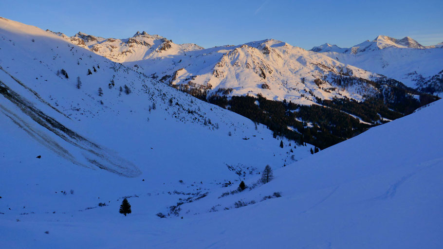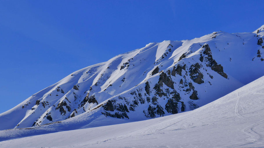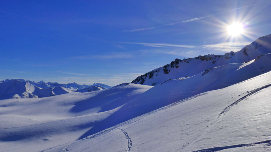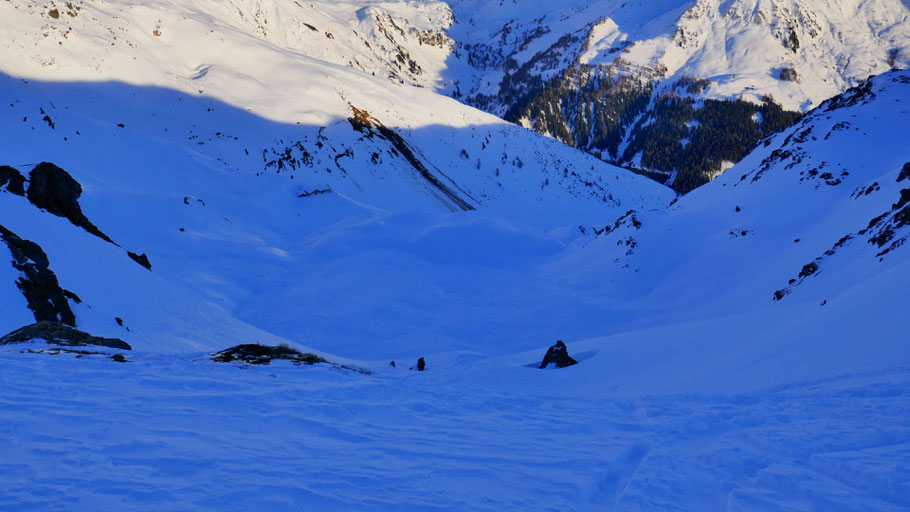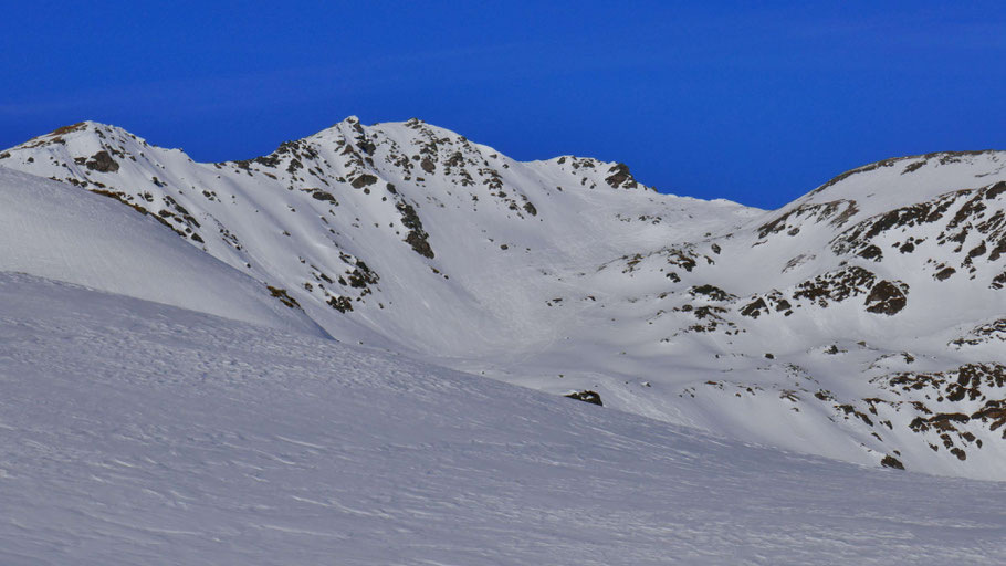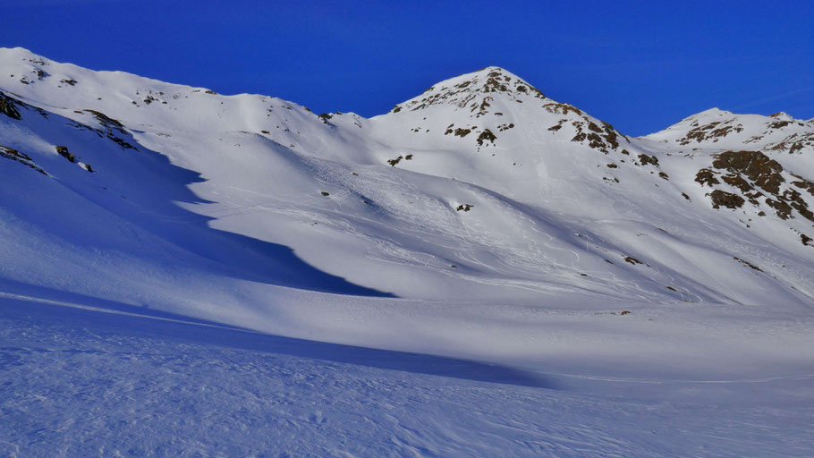 Das Arztal, aus dem die Standard-Skiroute auf die Seeblesspitze führt. Man käme zur Scharte östlich des Gipfels und erspart sich dadurch den anspruchsvolleren Teil.