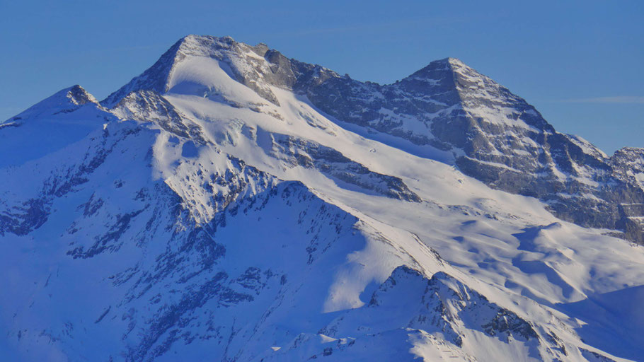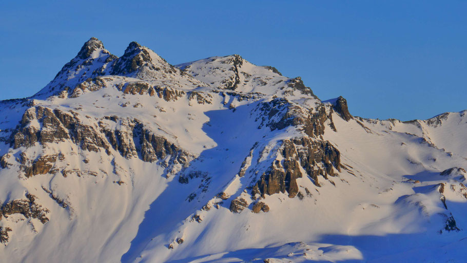 Schwierigkeitsgrad: Anstieg wenig schwierig (WS), am Gipfelaufbau zuerst per Spitzkehren steil aufwärts (S), je nach Verhältnissen die letzten Meter mit Ski in der Flanke oder in leichter Kletterei am Grat.
