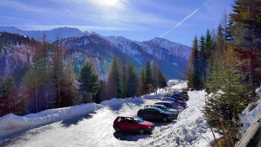Am frühen Nachmittag Abmarsch vom Parkplatz bei den Grünhöfen (1.510m). Die Schneelage ist gut, ich erwarte ein Portion Sonne gepaart mit Bruchharsch. Von beidem sollte ich reichlich bekommen.