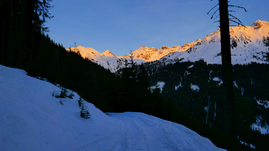 Im Schatten friert die Spur schon an, sehr rutschig. Daher kommen bald die Harscheisen drauf.