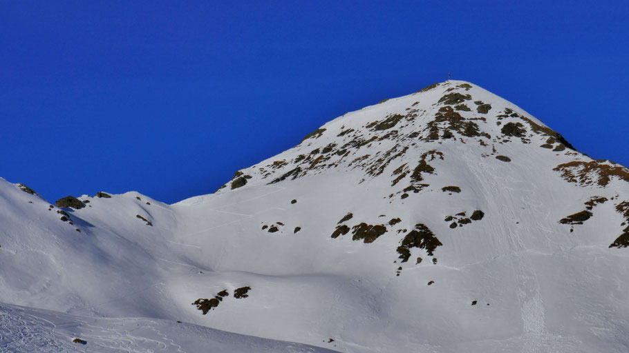 Das immens stark verspurte Naviser Kreuzjöchl rechts im Hintergrund, das sichtbare Kreuz ist jenes von Pkt. 2.350m.