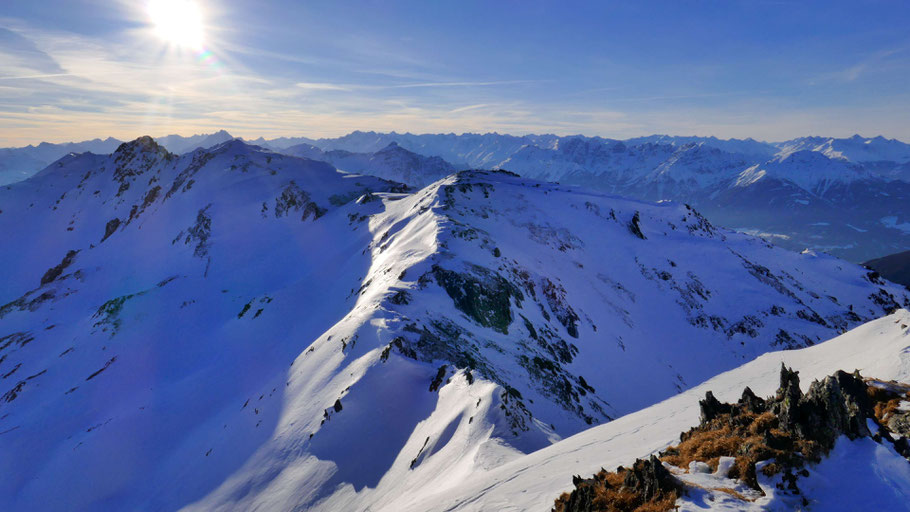 Am Grat. Dort drüben das Pfoner Kreuzjöchl (2.640m), das Roman schon einmal auf dessen ruhigerer Seite von Pfons aus mit Ski besucht hat.