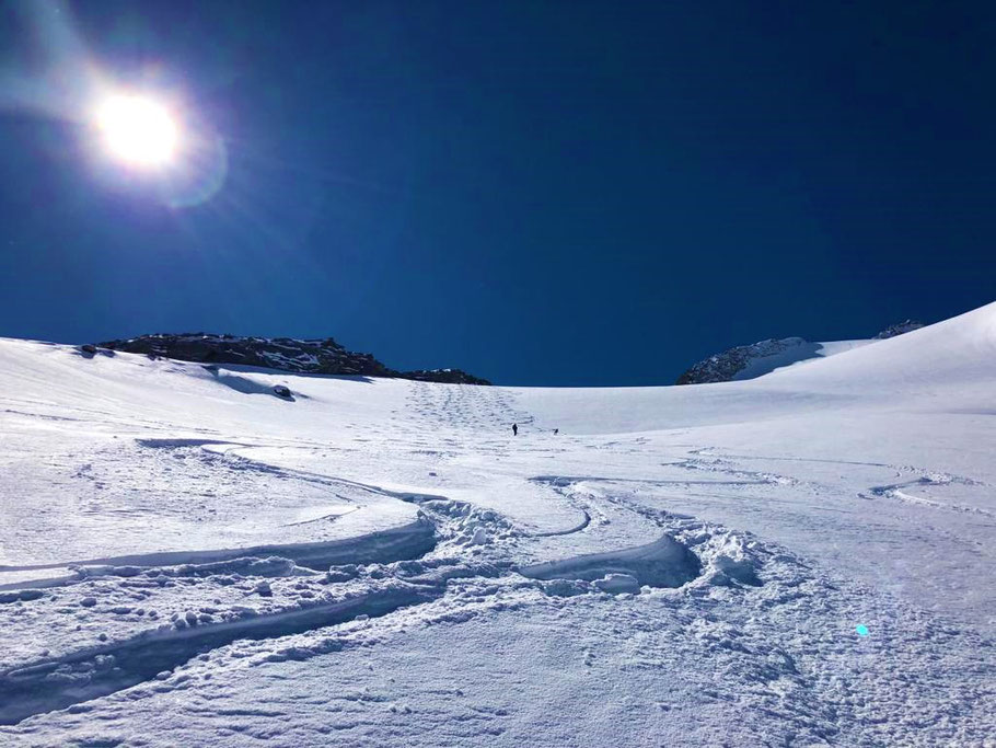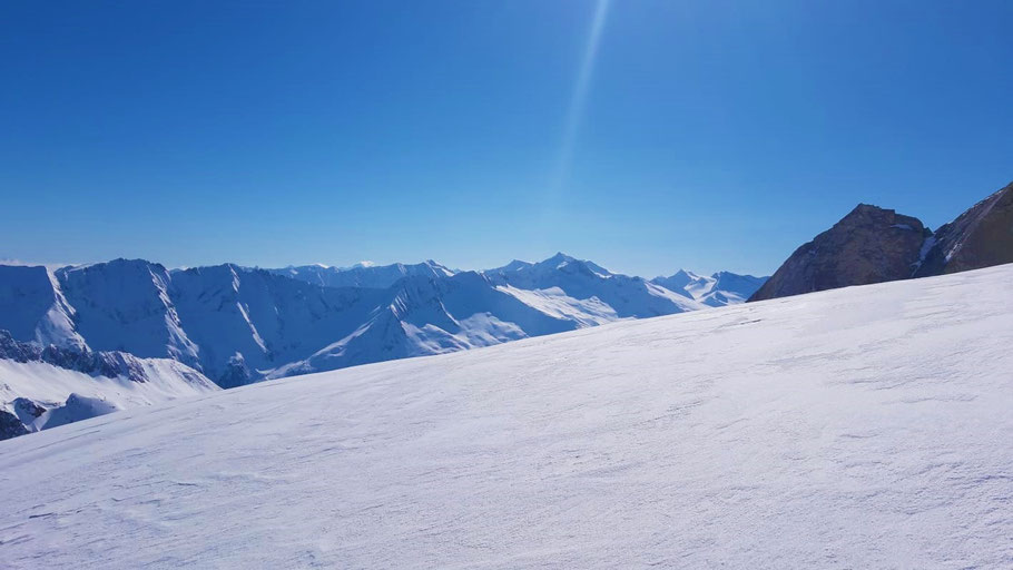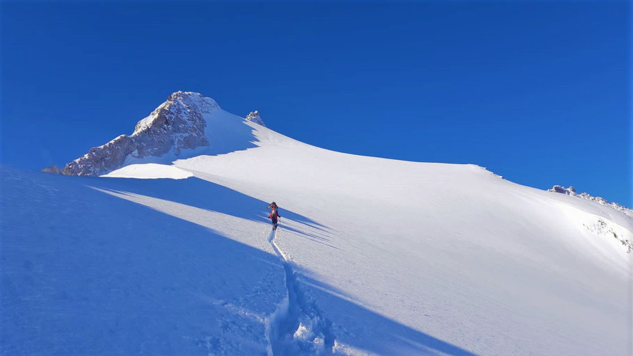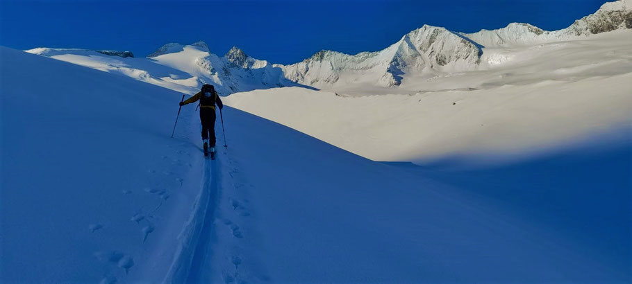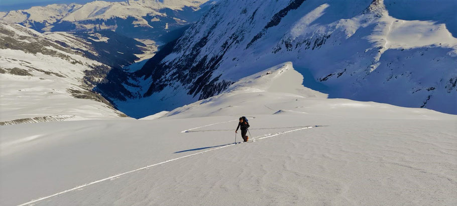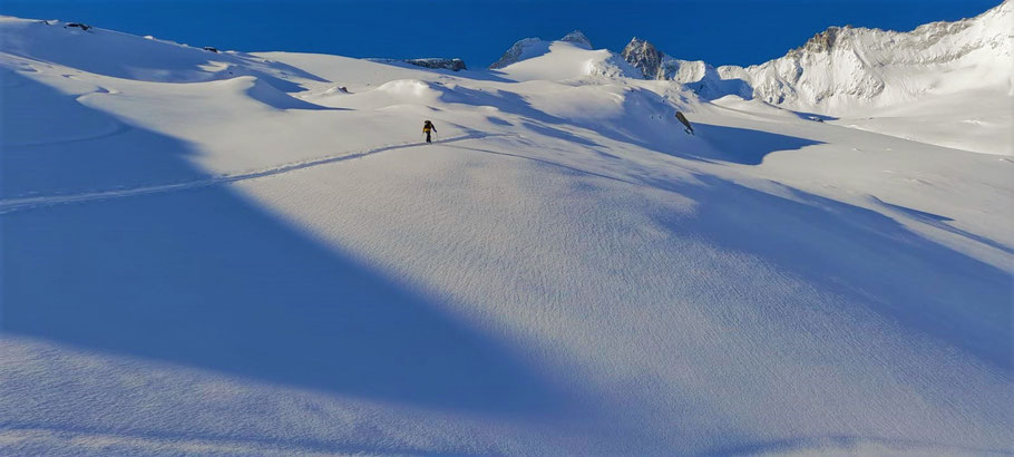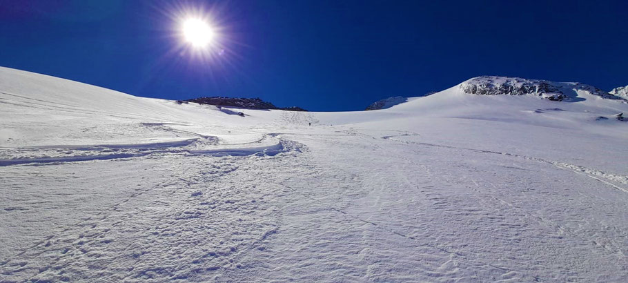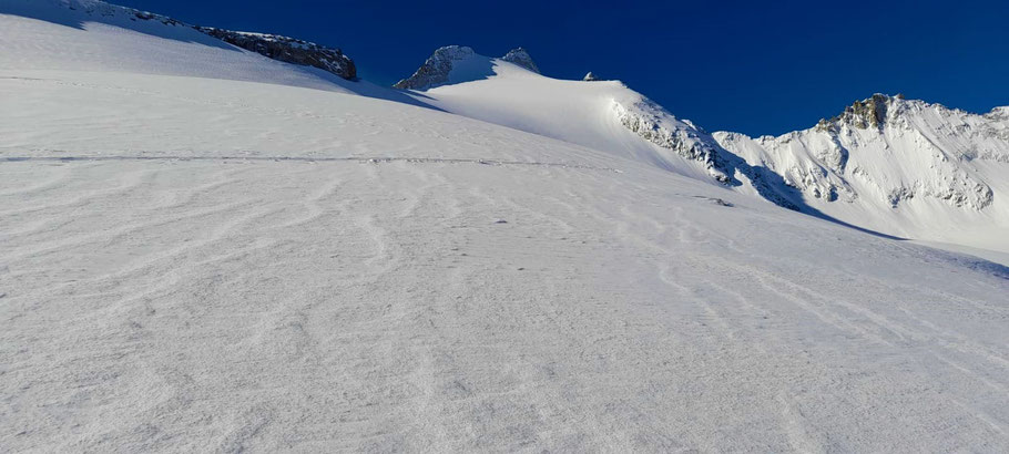 Um auf die in vielen Tourenberichten vorgeschlagene linke Aufstiegsseite der Moräne zu gelangen, müssen wir noch schnell einen etwas steileren Hang queren (Abzweigung zur Zittauer Hütte). Fortan schreiten wir ob der Schönheit dieses Panoramas fast schwerelos durch ein Tälchen entlang der Mörane zum Wildgerloskees empor. In diesem Streckenabschnitt wird uns zudem schön langsam bewusst, dass uns heute ein „Pulvertraum“ (O-Ton Dani) erwarten wird: die Spuren werden minutiös tiefer und der Abstand zu zwei Mädels aus dem Pinzgau wird zunehmend kleiner. Ab einer Höhe von 2500m lösen Daniel und meine Wenigkeit die mit Seil als zusätzliche Last ausgestatteten topfitten Skibergsteigerinnen ab und übernehmen abwechselnd die Spurarbeit. Florian, unser drittes Mitglied im Bunde, folgt uns mit mathematisch errechnetem Sicherheitsabstand auf Schritt und Tritt. Unser weiterer Weg führt uns in mittelsteilem Gelände zu einem markanten Felskamm und an einer Megawechte vorbei direkt in eine Gletscherkuppe, namens „Glatze“, unter den Felsgipfel. Die letzten Höhenmeter werden wir von einem weiteren Tourengeher, der in gefühltem Rekordtempo an uns vorbeischoss, als Spurbob abgelöst.