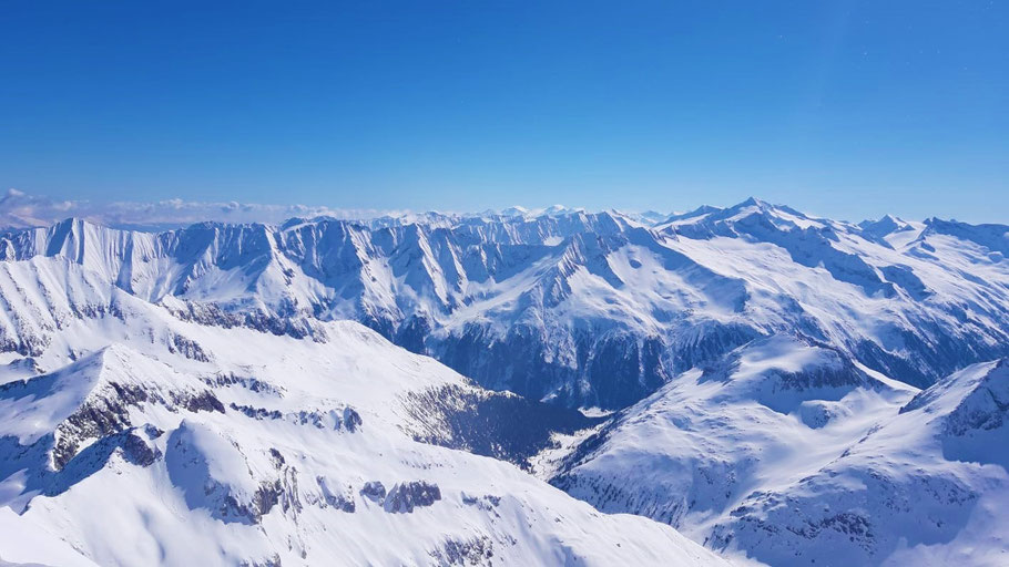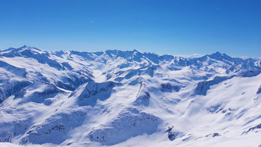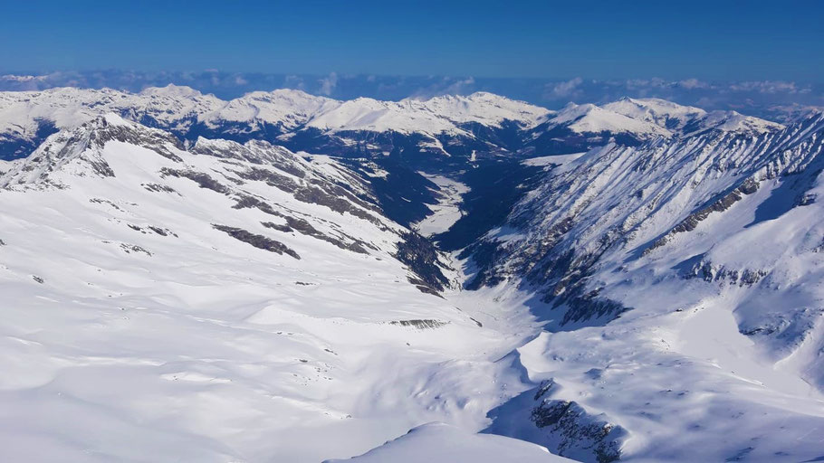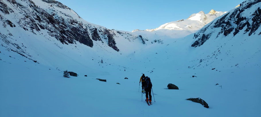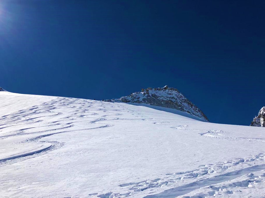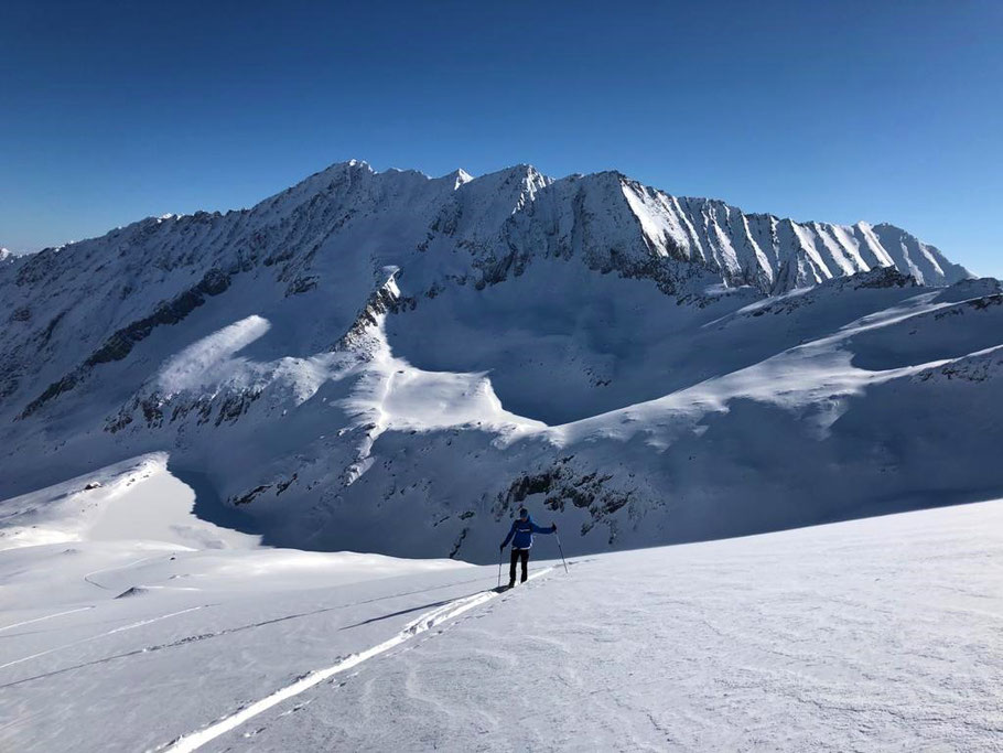 Um auf die in vielen Tourenberichten vorgeschlagene linke Aufstiegsseite der Moräne zu gelangen, müssen wir noch schnell einen etwas steileren Hang queren (Abzweigung zur Zittauer Hütte). Fortan schreiten wir ob der Schönheit dieses Panoramas fast schwerelos durch ein Tälchen entlang der Mörane zum Wildgerloskees empor. In diesem Streckenabschnitt wird uns zudem schön langsam bewusst, dass uns heute ein „Pulvertraum“ (O-Ton Dani) erwarten wird: die Spuren werden minutiös tiefer und der Abstand zu zwei Mädels aus dem Pinzgau wird zunehmend kleiner. Ab einer Höhe von 2500m lösen Daniel und meine Wenigkeit die mit Seil als zusätzliche Last ausgestatteten topfitten Skibergsteigerinnen ab und übernehmen abwechselnd die Spurarbeit. Florian, unser drittes Mitglied im Bunde, folgt uns mit mathematisch errechnetem Sicherheitsabstand auf Schritt und Tritt. Unser weiterer Weg führt uns in mittelsteilem Gelände zu einem markanten Felskamm und an einer Megawechte vorbei direkt in eine Gletscherkuppe, namens „Glatze“, unter den Felsgipfel. Die letzten Höhenmeter werden wir von einem weiteren Tourengeher, der in gefühltem Rekordtempo an uns vorbeischoss, als Spurbob abgelöst.