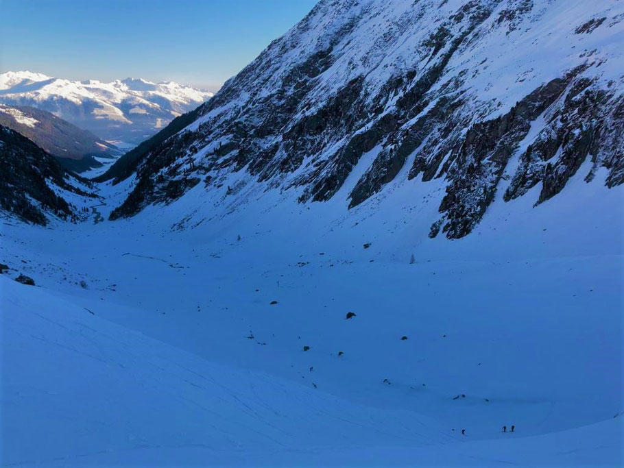 Kurz nach diesem kleinen Almendorf geht es vorwiegend flach weiter bis zur Materialseilbahn der Zittauer Hütte. Auf der linken Seite lassen sich an den steilen Hängen die für diese Jahreszeit typischen Boten in Form von an den vergangenen Tagen entstandenen Lawinenkegeln gut erkennen.