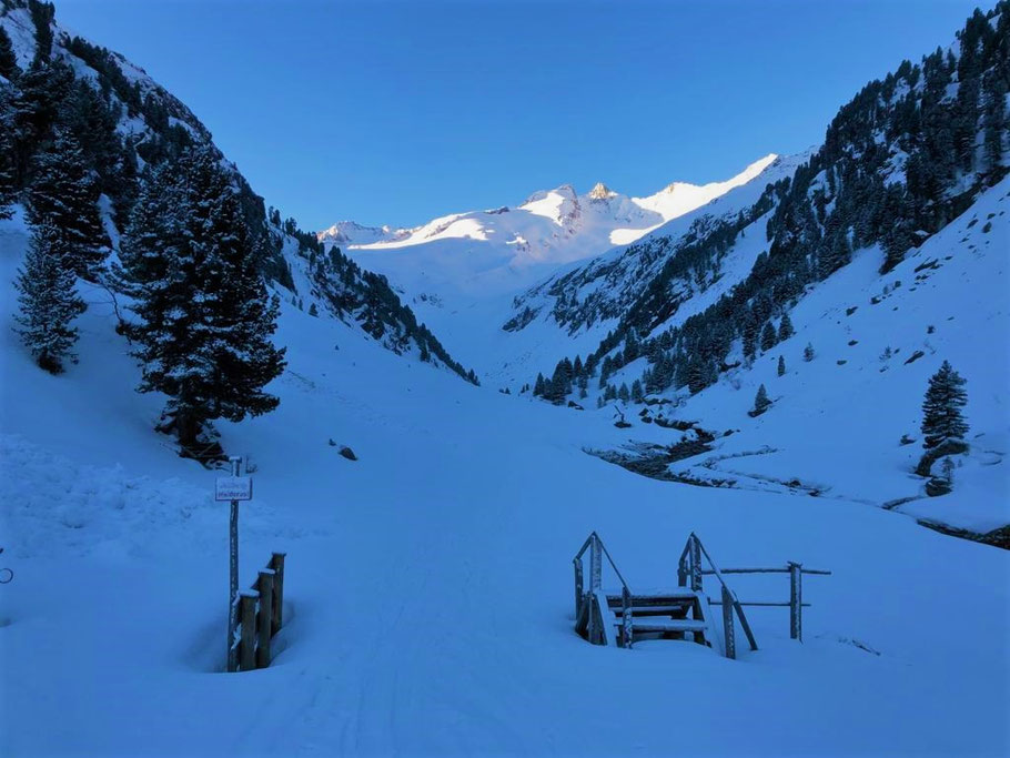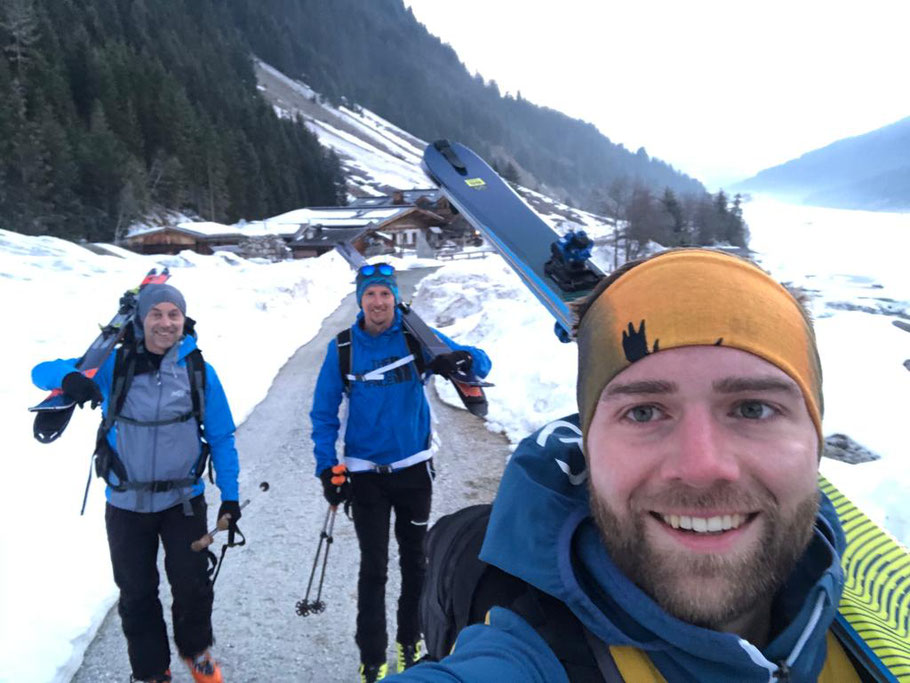 Unser Ziel bereits vom ersten Schritt an vor Augen starten wir hochmotiviert zu dritt direkt am Parkplatz beim Gasthaus Finkau im Wildgerlostal am Ende des Speichersees Durlaßboden unsere Tour bei kuscheligen -4°C. Die ersten 200m geht es auf einem Forstweg mit geschulterten Ski bis zu einer kleinen Brücke. Dort schnallen wir unsere Aufstiegshilfen an und meistern die ersten 200 Höhenmeter in moderater Steigung auf einem schmalen Almweg bis zur Trisslalm.