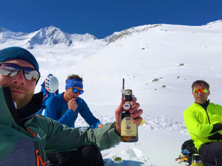 Nichtsdestotrotz und in freudiger Erwartung auf eine unvergessene Pulverabfahrt verweilten wir trotz kaltem Wind noch kurz in Gipfelnähe. Nachdem wieder etwas Gefühl in unsere eingefrorenen Finger zurückgekehrt ist, tauchen wir für 1000 Höhenmeter in ein Wattemeer aus Schnee. Kurz vor der Steilstufe auf 1900m lassen wir uns im Schnee nieder um unsere mitgebrachte Jause zu genießen. Mit einem letzten Blick zurück auf unsere in den Schnee gezogenen Linien gleiten wir die letzten Kilometer auf feinstem Firn zurück ins Tal. Glücklich und zufrieden beschließen wir unsere Tour standesgemäß mit Gerstensaft aus der Region.