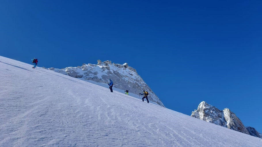 Im Sechserpack erreichen wir dann als Erste an diesem Tag das Skidepot und entledigen uns erstmals unserer Tourenskier. Schnell fassen wir den Entschluss mit Steigeisen und Pickel ausgestattet den nicht mehr allzu weit entfernten Gipfel zu erklimmen. Doch schon auf den ersten Tritten und Kletterpassagen wird uns die Schwierigkeit dieses Unterfangen klar. Der Abbruch erfolgt wenig später an einer ausgesetzten Stelle, an der die zwei Salzburgerinnen trotz Seil rekapitulieren. Auch der Tourengeher, der uns kurz vor dem Skidepot einholte, berichtet, dass er den Aufstieg kurz oberhalb von uns abbrach.