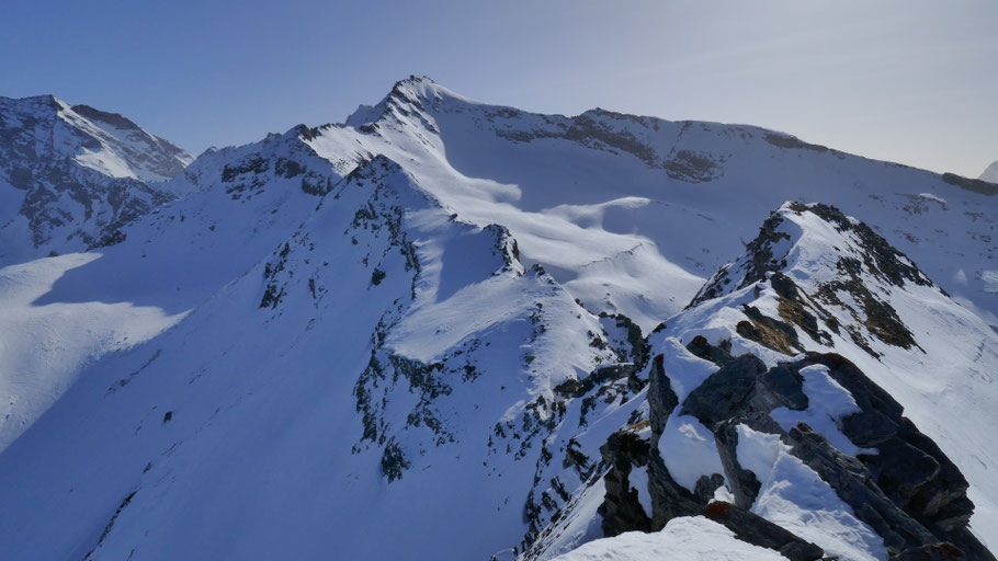 Ein Stück steige ich den Grat südwärts weiter, um einen freien Blick zum Kraxentrager (2.999m) zu bekommen. Das Sumpfschartl liegt auf etwa halbem Weg, ist aber hier durch einen Gratkopf verdeckt.
