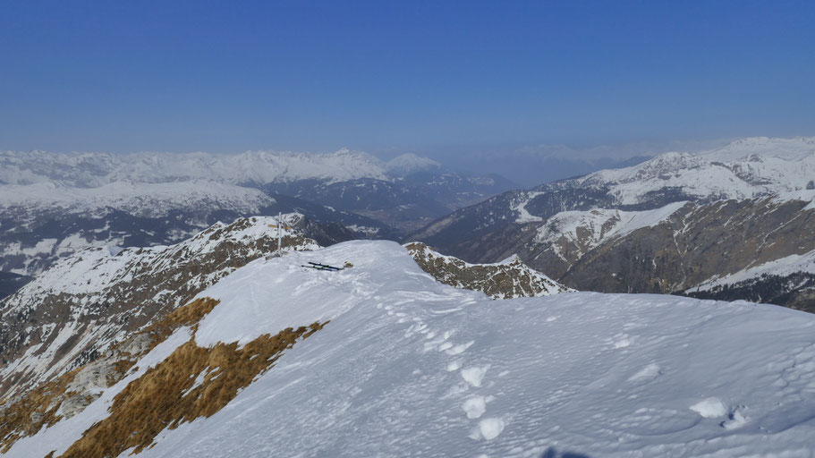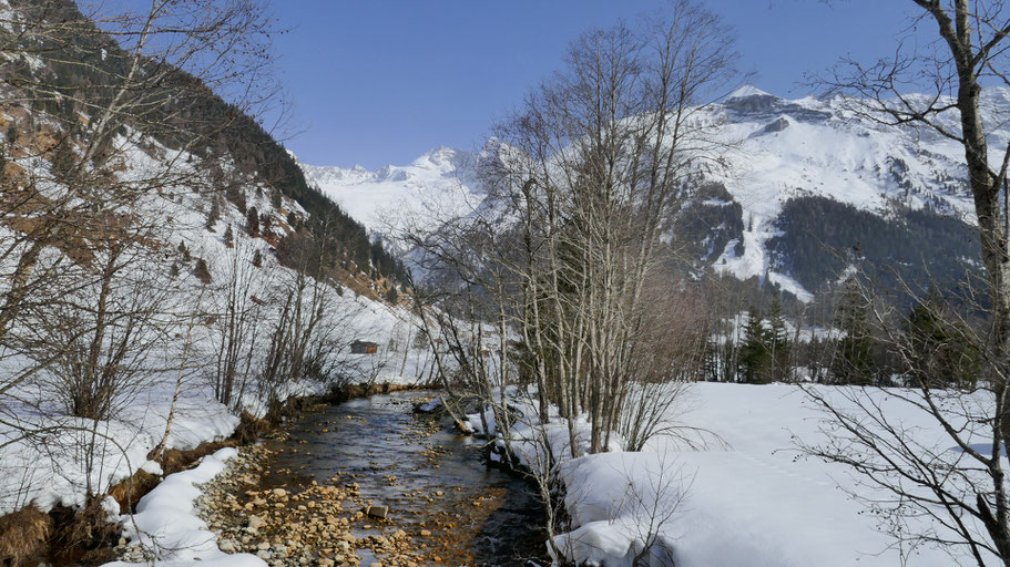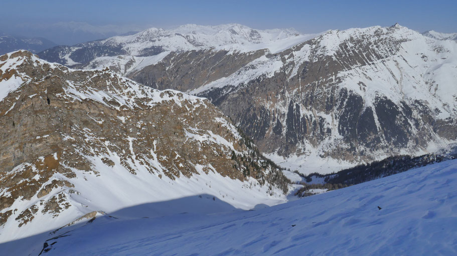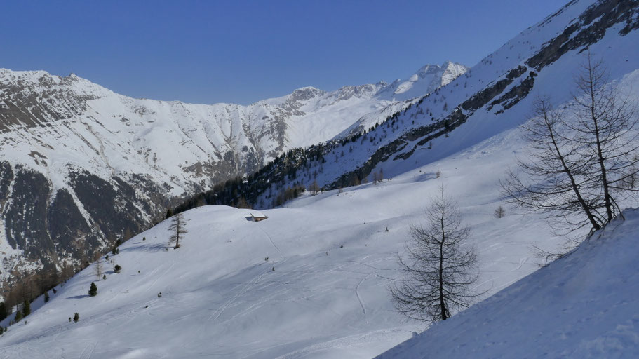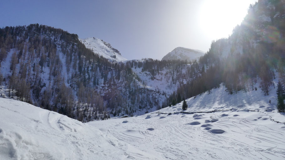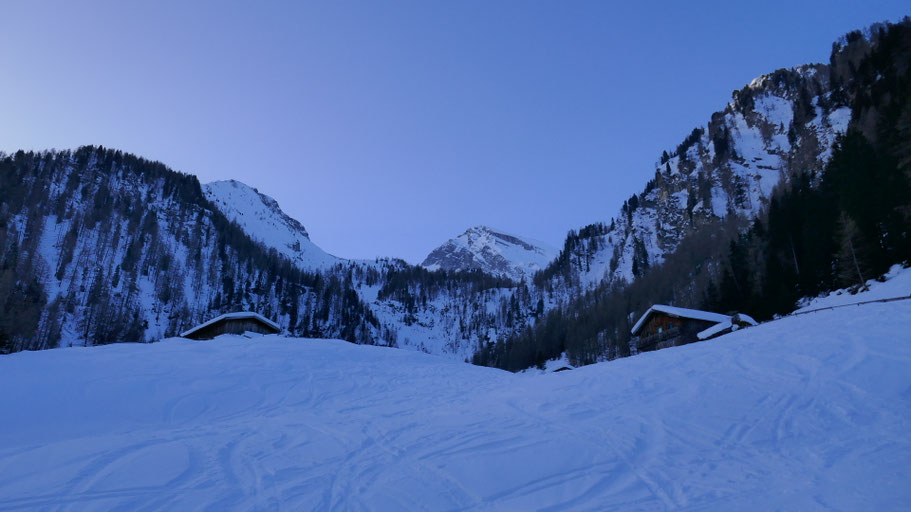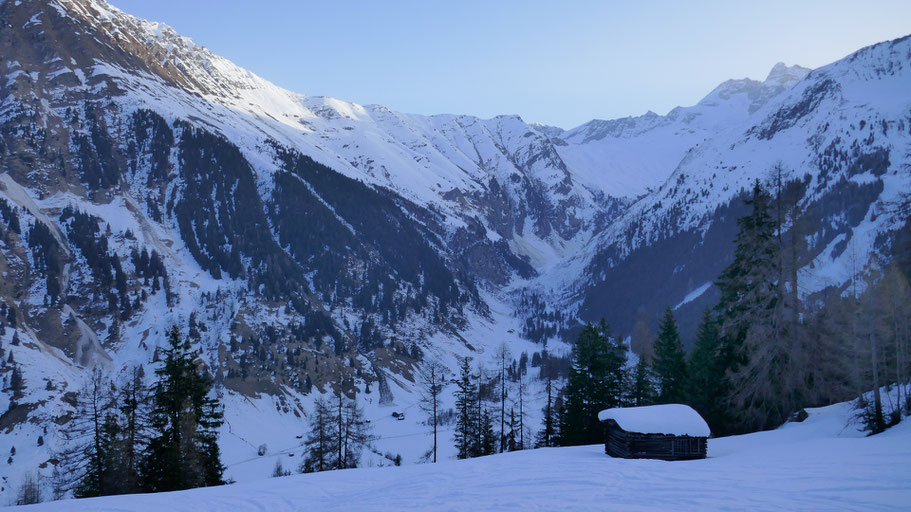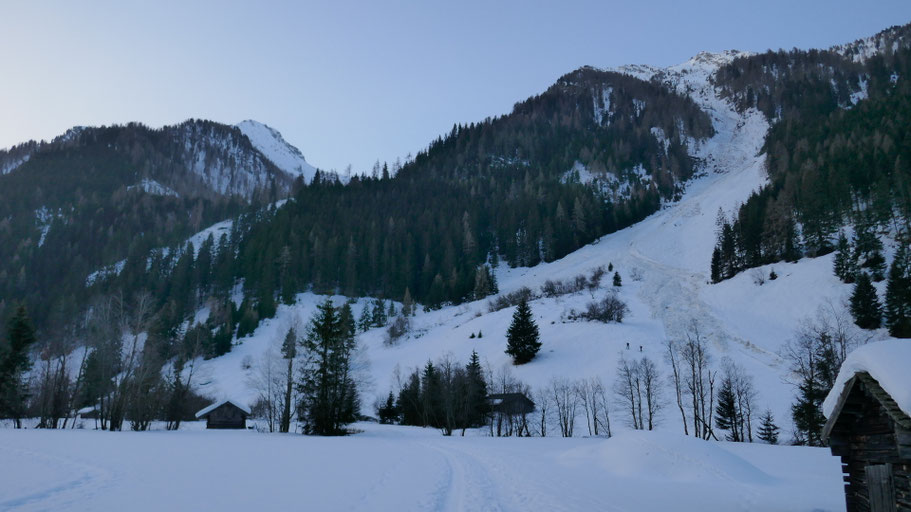 Saharastaub liegt in der Luft, für den Vormittag noch recht windstill angesagt - ab ins Valser Tal. Zwei Skitourengeher sind schon am Weg zur Bloaderalm und versuchen, den optimalen Weg durch den Lawinenstrich zu finden.