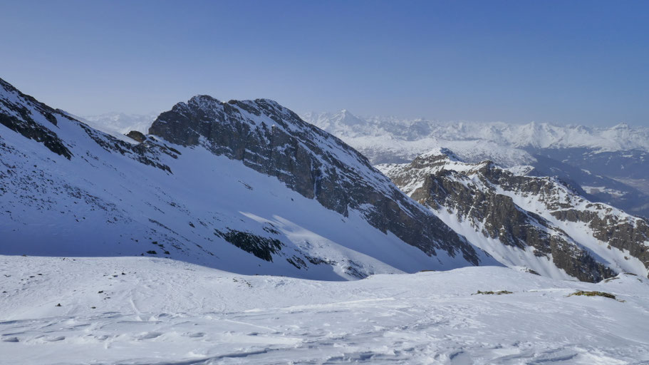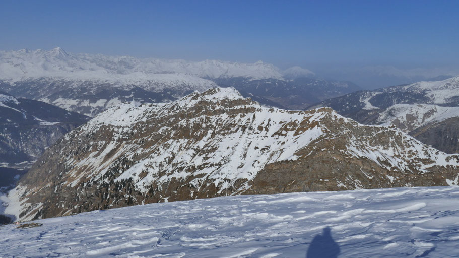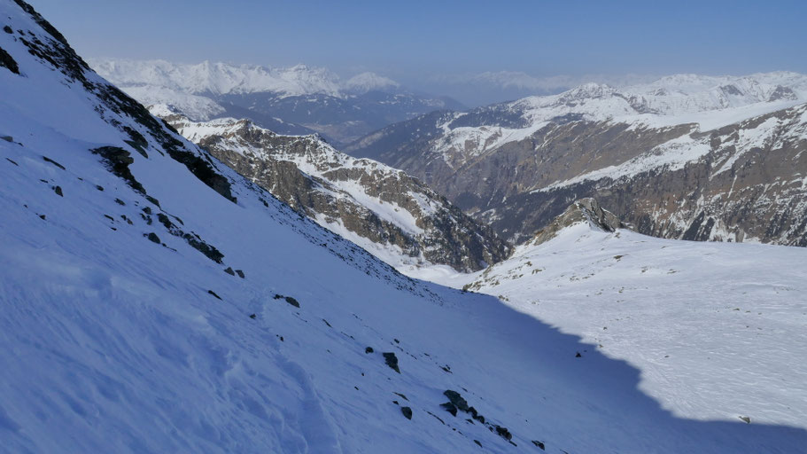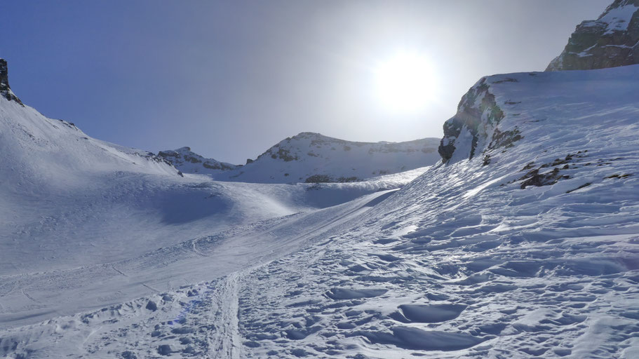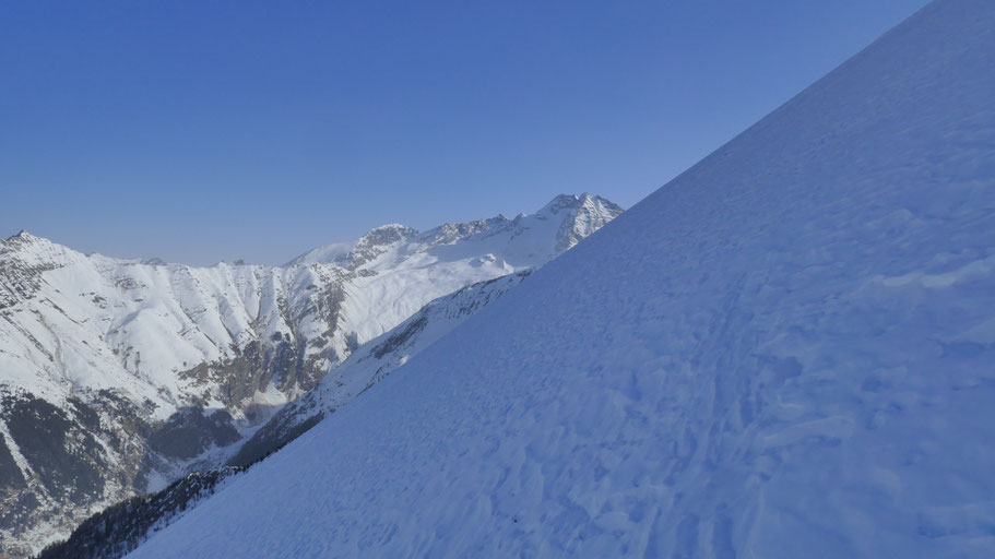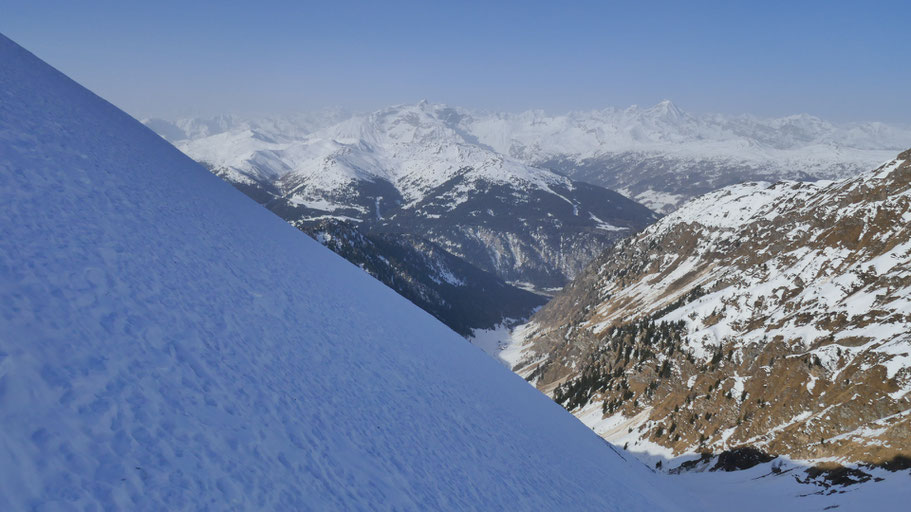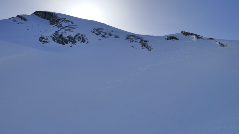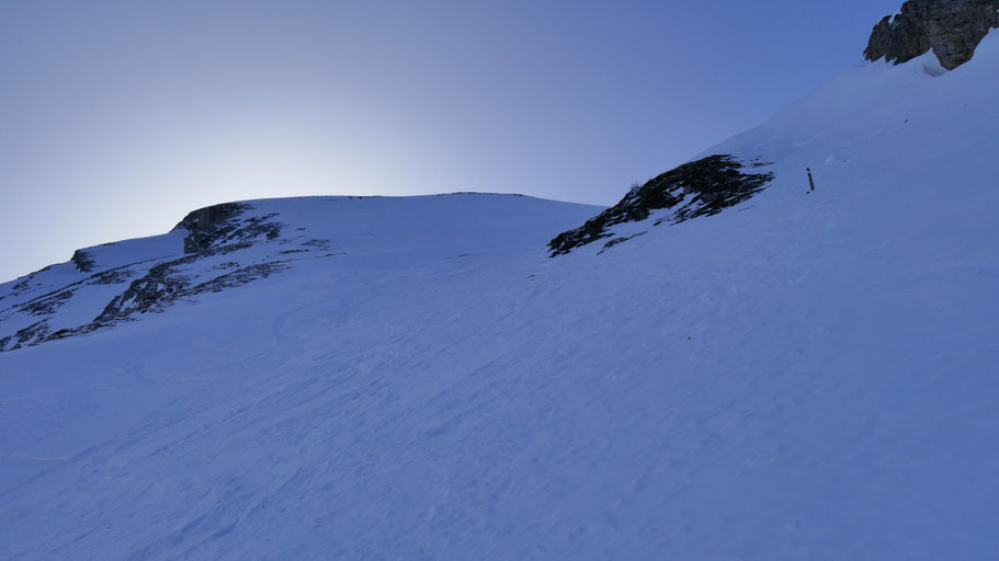 Im Westen in den Stubaiern offenbar höhere Staubkonzentration. Nach dem ersten Hang mit etwas über 35° eine kleine Verflachung, ...
