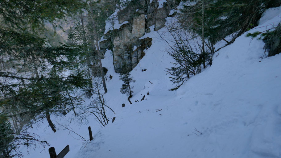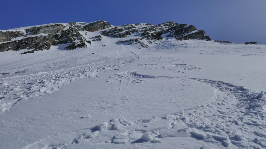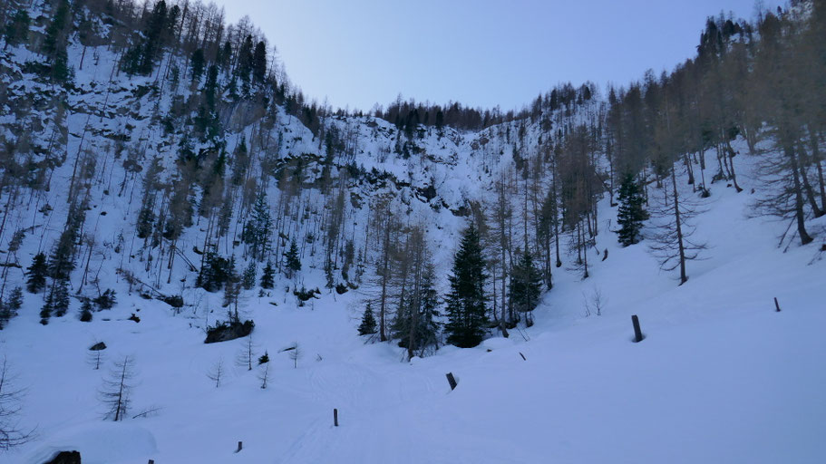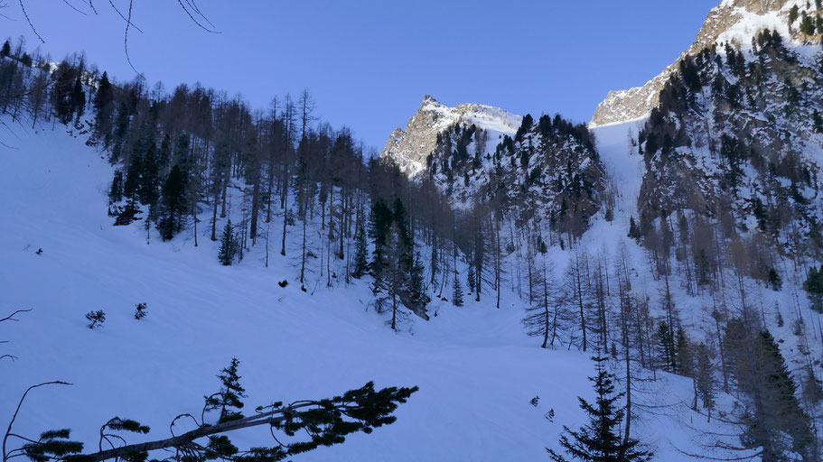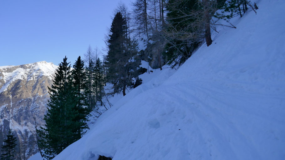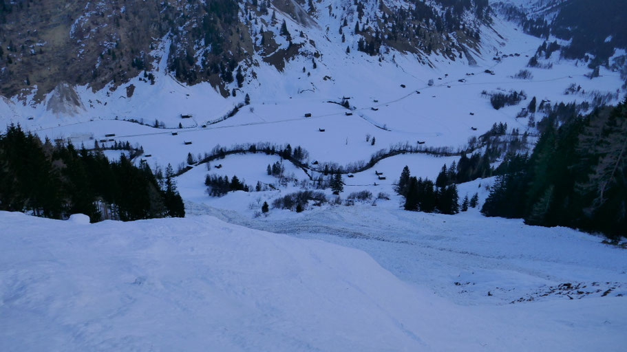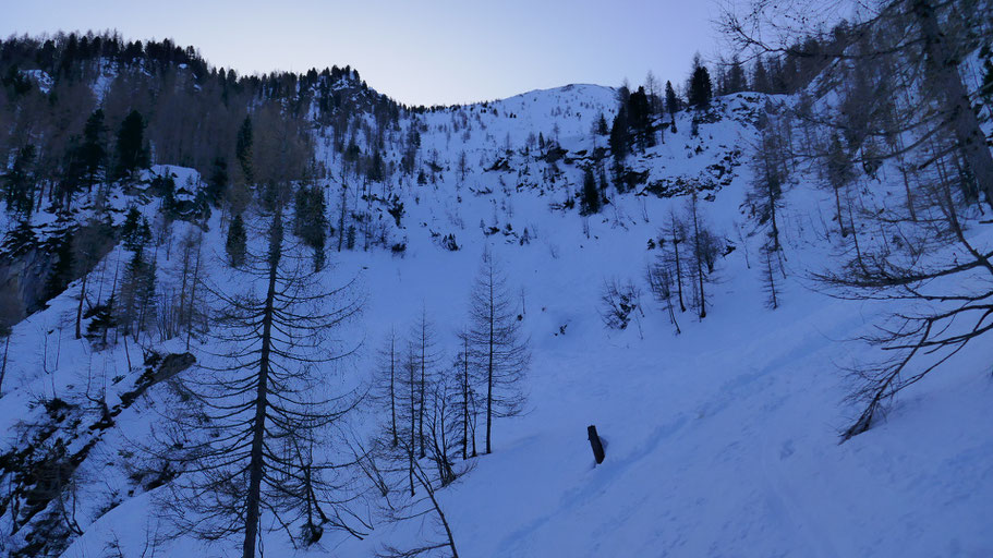 Der Februar 2021 zeichnet sich durch frühjahrsähnliche Verhältnisse aus. Die Lawine ist schon herunten und präsentiert sich hart gefroren. Daher im Aufstiegssinn eher rechts im Wald gehalten.