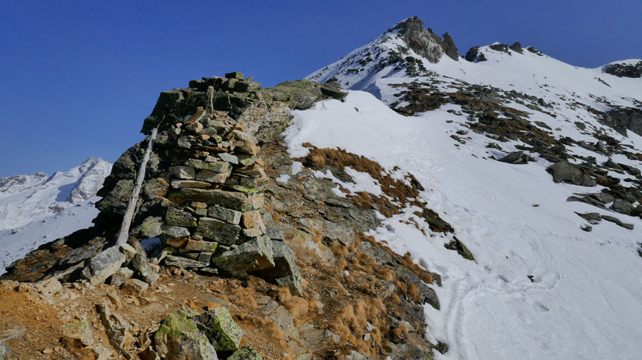Kurz unterhalb des Schartls (2.666m) empfängt mich eine steife Brise, also rasch auf die Sonnenseite gewechselt ...