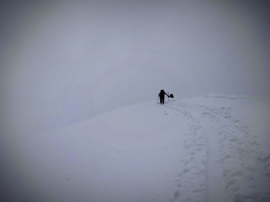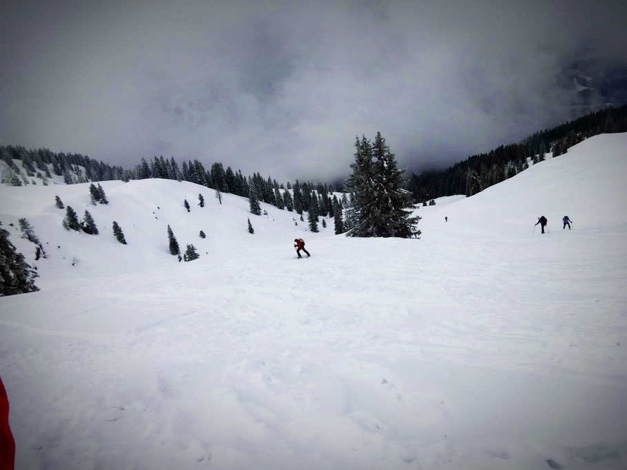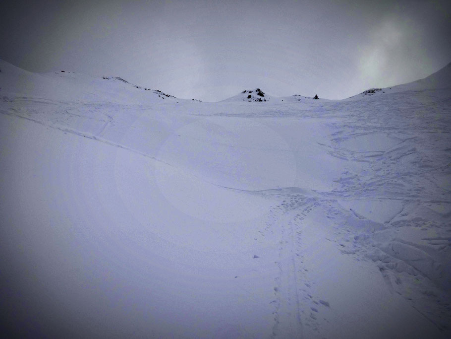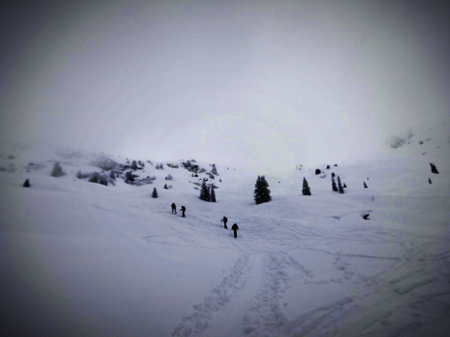Ein schönes Aufstiegsgebiet mit wenig Gefahren wartet - die Nebeldecke hat heute etwas dämpfend beruhigendes an sich.