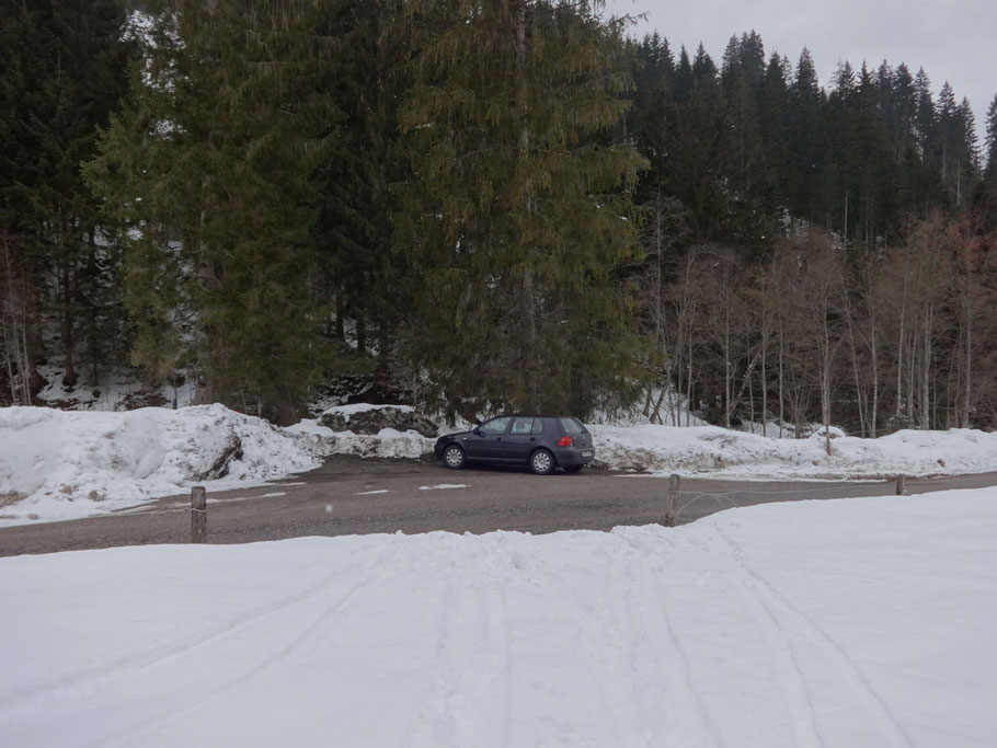 Los geht meine Skitour unter einer dicken Nebeldecke, die heute zäh ist. Ein kleiner Parkplatz dient mir als Startpunkt.