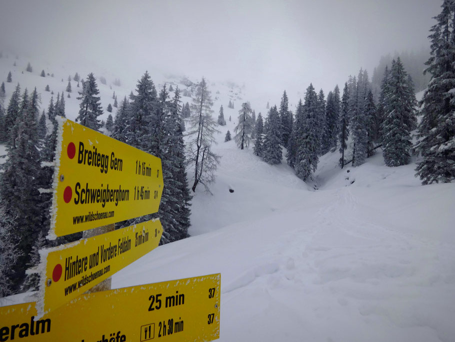 Bis zum Westhang des Schwaigberghorns wenig gefährdetes Gelände - Schlussanstieg steil, verlangt gute Verhältnisse - Übergang zum Breiteggern erfordert eine sichere Lage sowie gute Fähigkeiten. Direkte Abfahrt vom Breiteggern je nach Schneelage gefährdet.