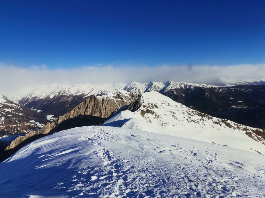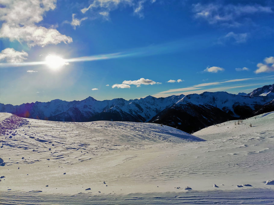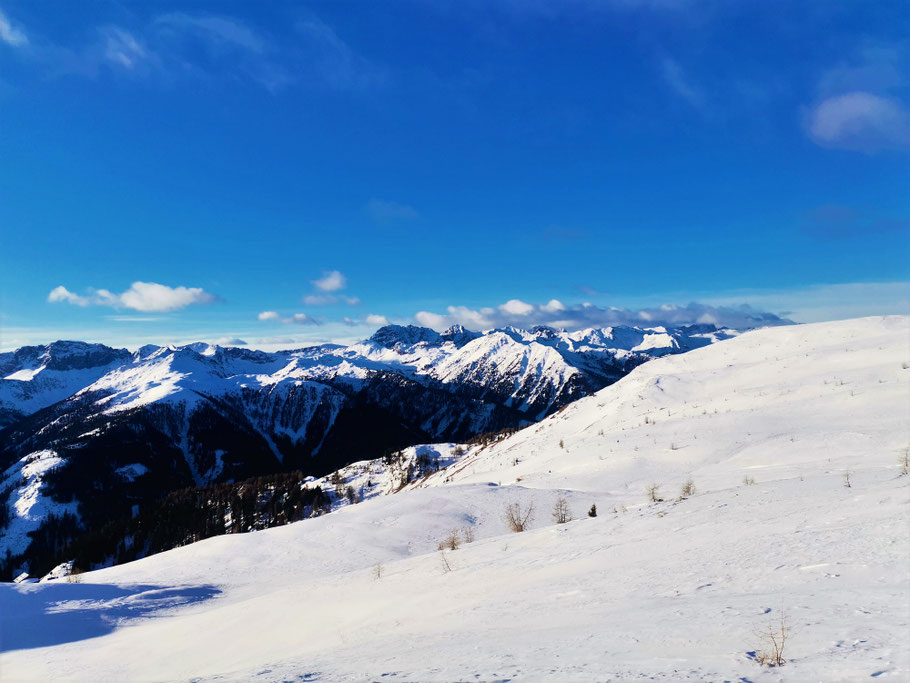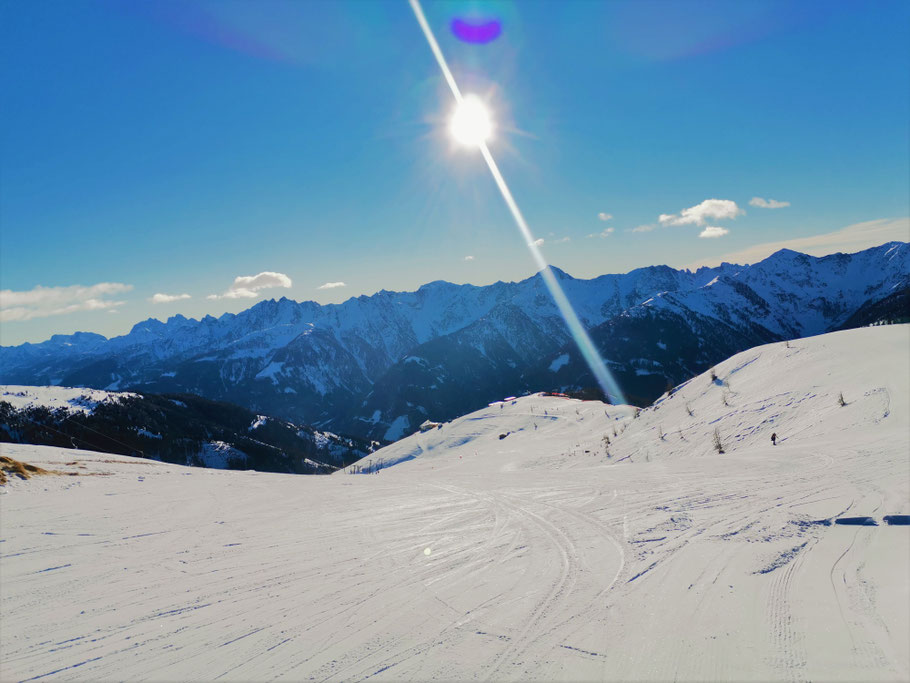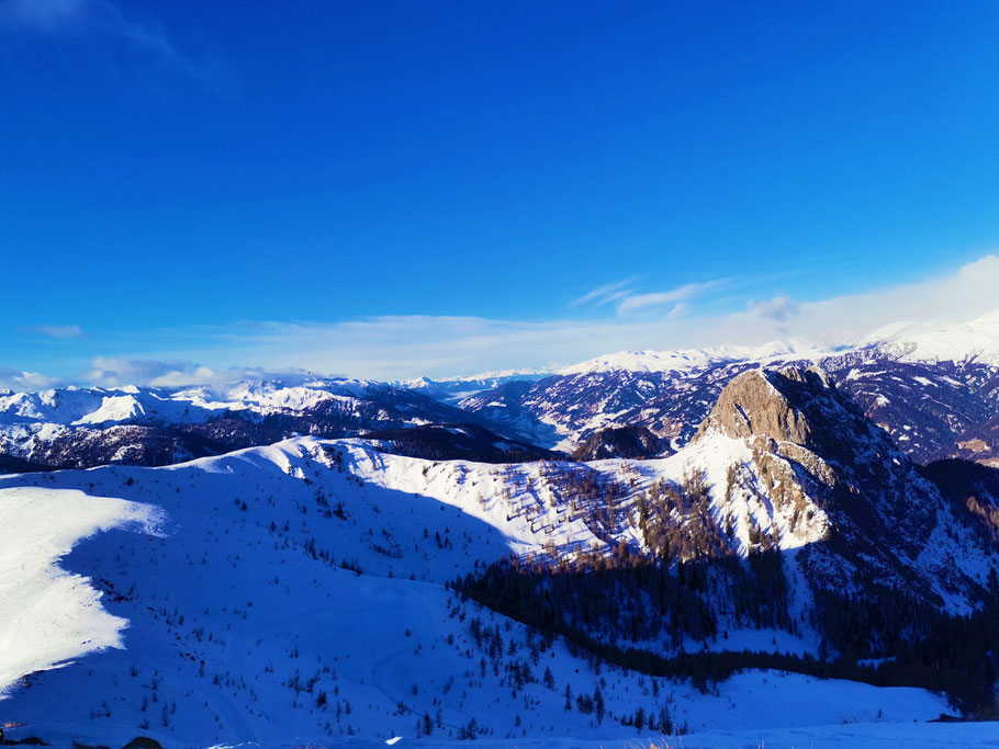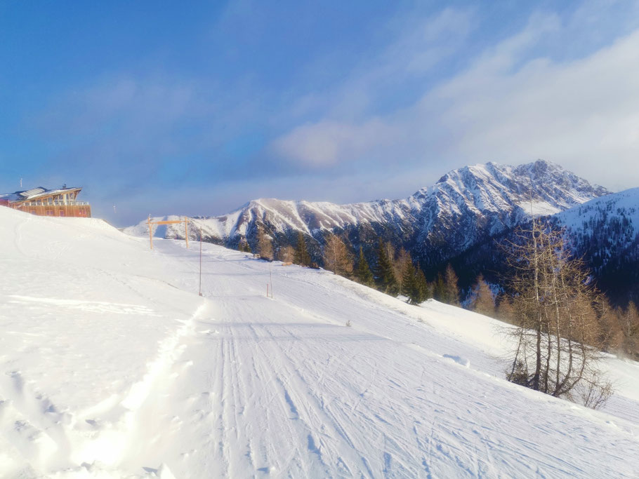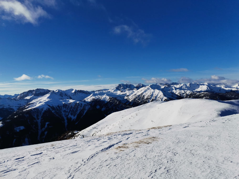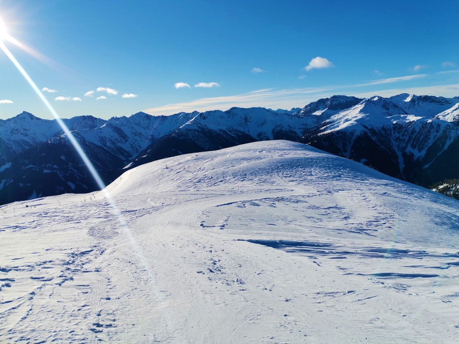 Als Krone des Skigebiets ist der Golzentipp (2317 Meter) weit weg vom Geheimtipp - und dennoch lädt der westliche Ausläufer der Gailtaler Alpen zum Verweilen und Genießen ein. Die herrliche Aussicht gepaart mit einem (je nach Route) einfachen Anstieg lässt den Hausberg von Obertilliach (1450 m) zu einem feinen Skitouren-Ziel werden. Bei meiner Runde wähle ich aufgrund des Schneemangels nicht den Weg durch den Wald über das Gripp, sondern die gemütliche Rodelbahn zur Connyalm (2070 m). Von dort zieht sich sogar eine Loipe bis wenige Meter unter den Gipfel des Golzentipp - die Abfahrt erfolgt dann über das Skigebiet.