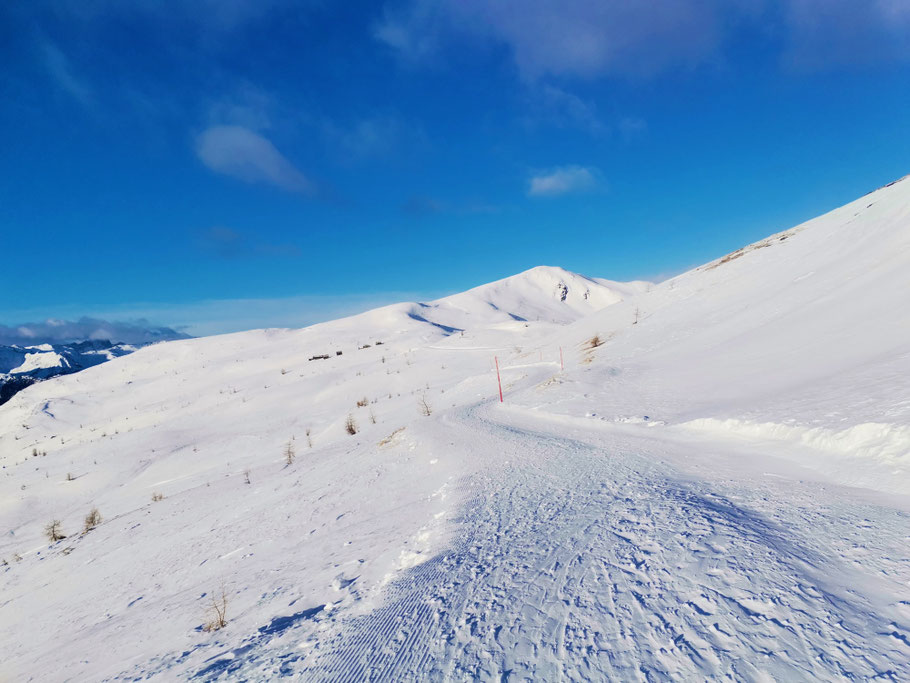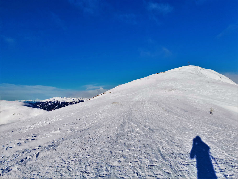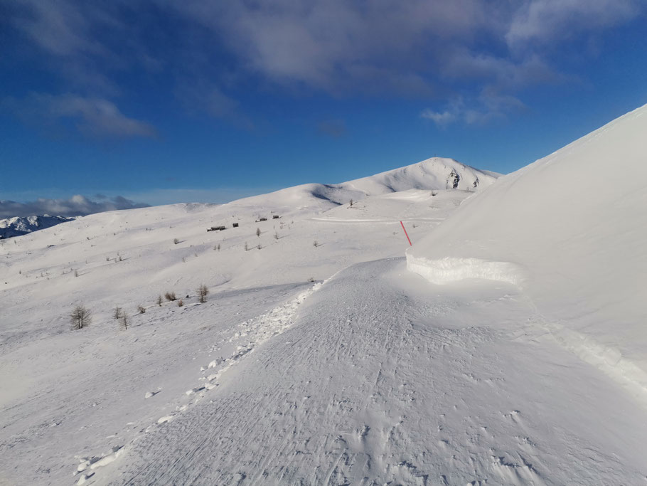 Punkt des Skigebiets auf 2260 zweige ich auf dem Winterwanderweg, zugleich Loipe, mit kurzem Gegenabstieg zum sichtbaren Gipfel ab.