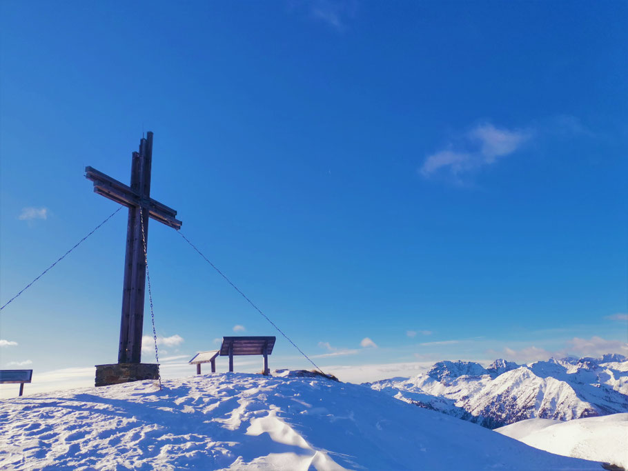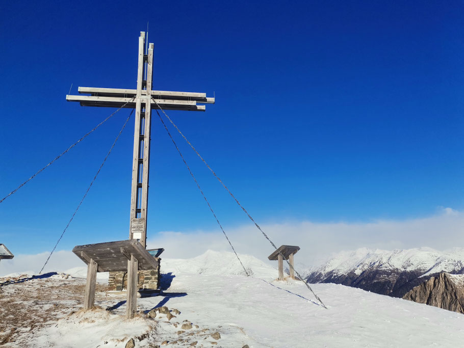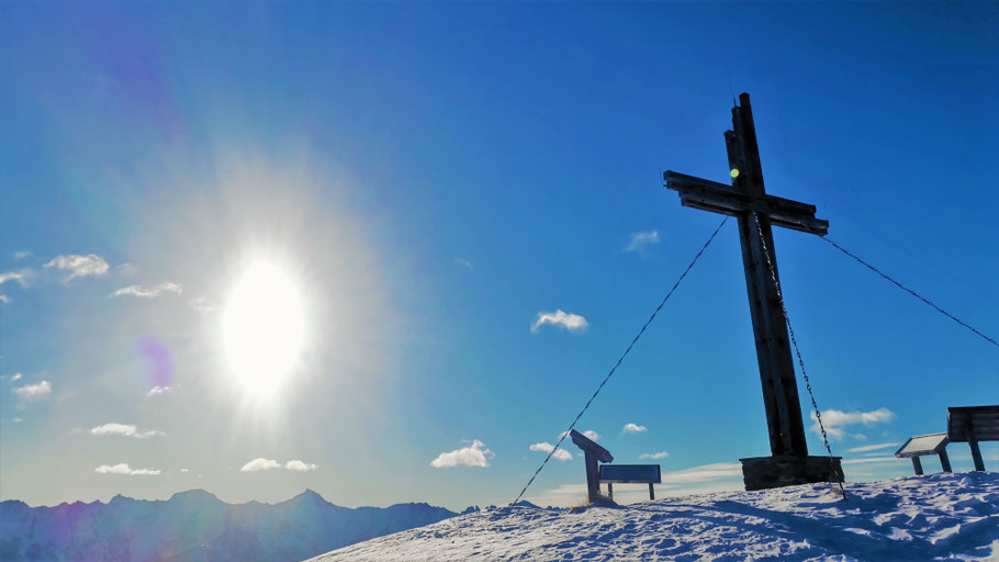 Das Gipfelkreuz des Golzentipp (2317 m) mit Schautafeln in alle Himmelsrichtungen.
