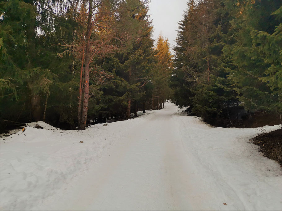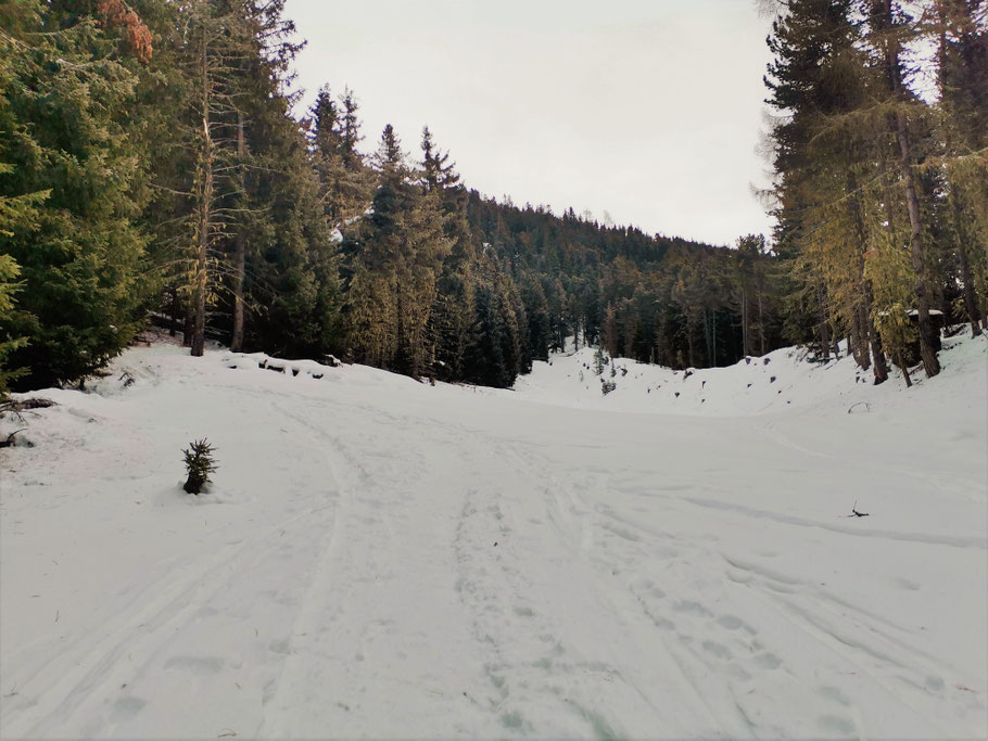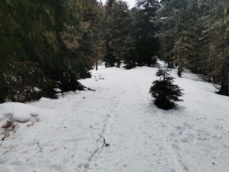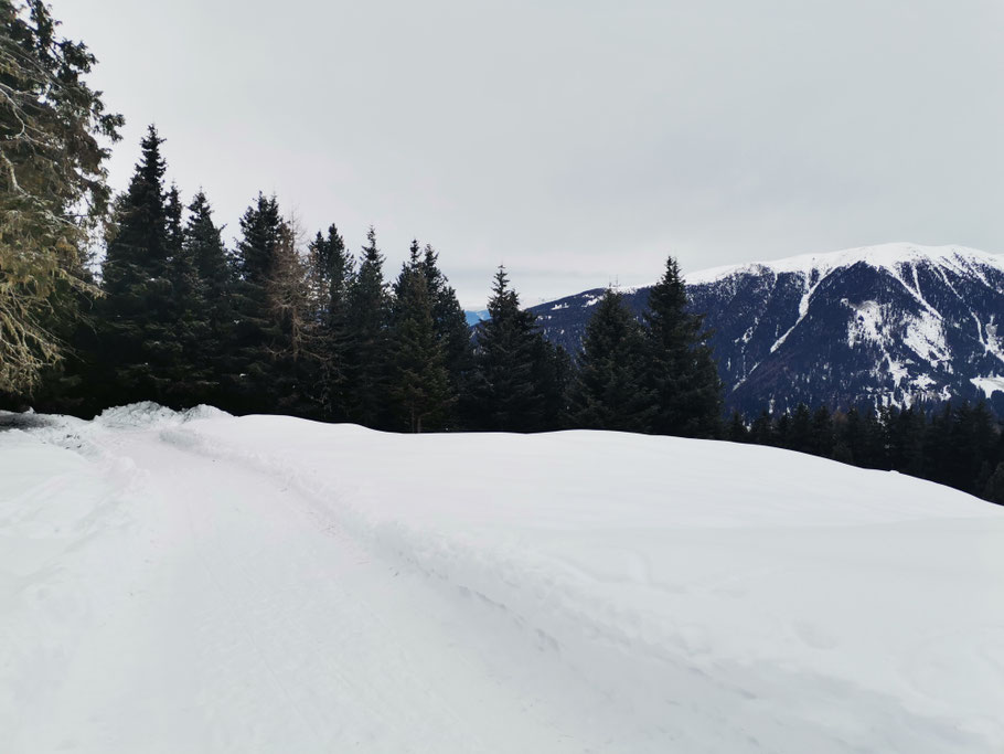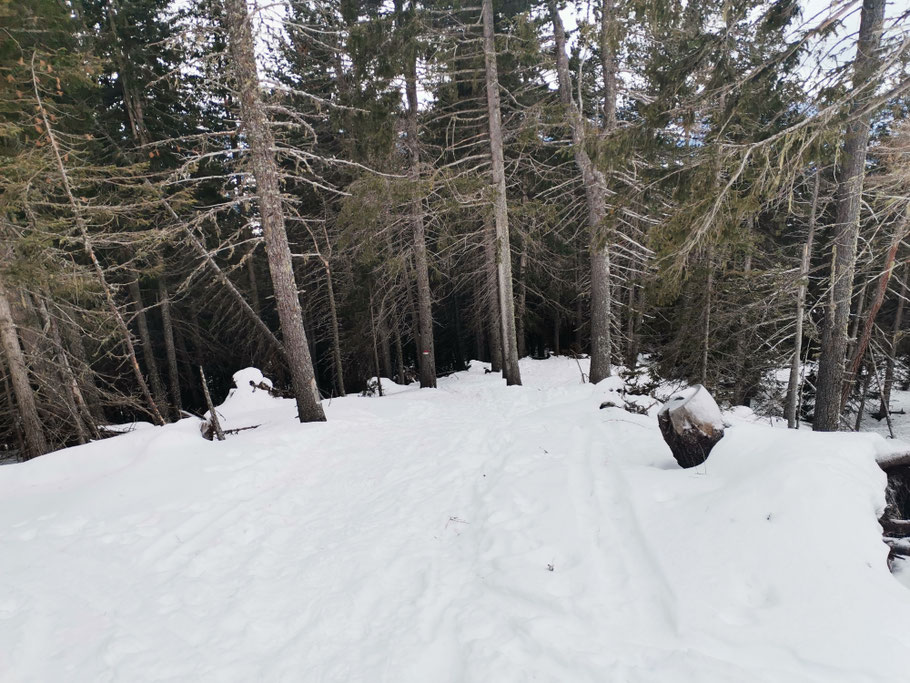 Nach wenigen Minuten auf der Rodelbahn zweige ich auf feiner Spur auf den Wanderweg ab, der sich mit gutmütiger Steigung bergan zieht.