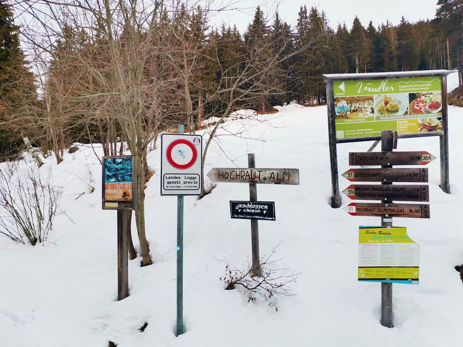 Mudlerhof (1590 m) auf ca. 1620 Metern. Von dort zieht sich der Aufstieg wahlweise über den Wanderweg durch den Wald oder auf der Rodelbahn des Mudlerhofs dahin. Vom Lutterkopf, der