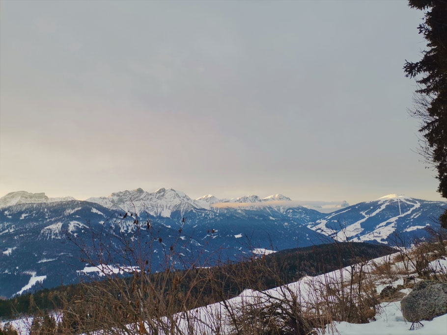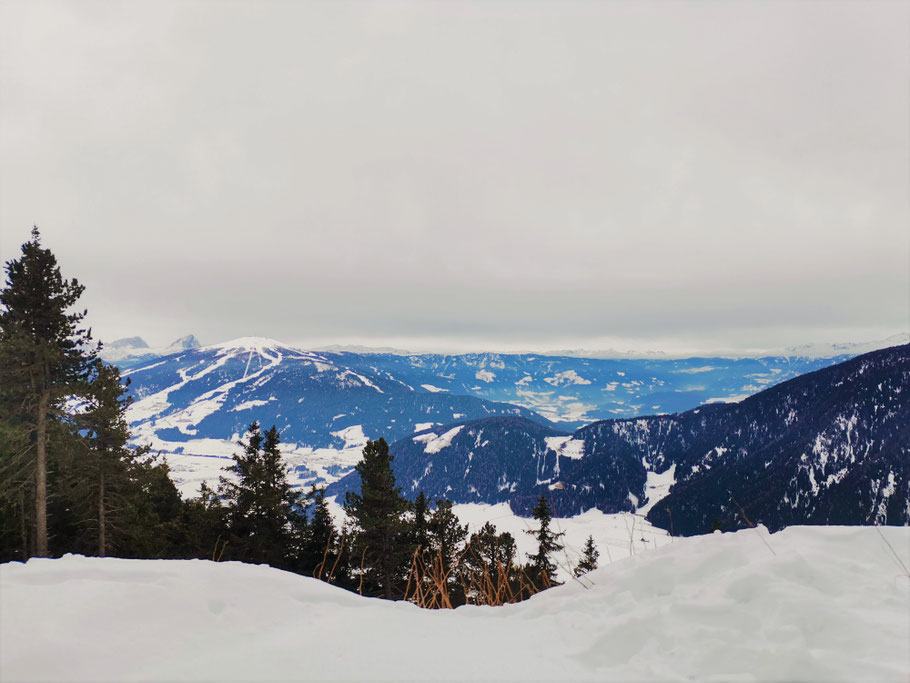 den Pragser Dolomiten mit dem Seekofel sowie rechts das Skigebiet am Kronplatz.
